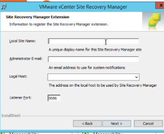 8. Enter your local site name ( i prefer to give vcenter name) and email address for sending    notifications. In drop down menu you will be able to see SRM server IP.