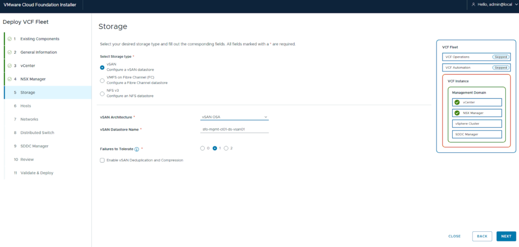 - Select the Storage type (FC, NFS, or vSAN).