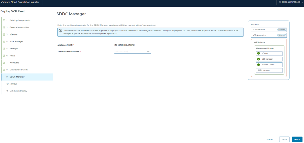 10. SDDC Manager Configuration: Since the VCF Installer or management ESX host was deployed first, it will be converted to the SDDC Manager.