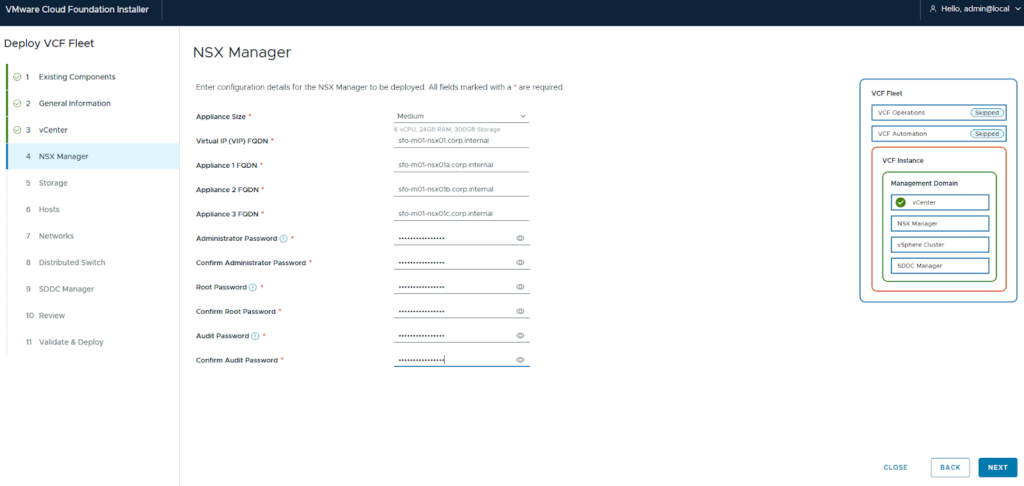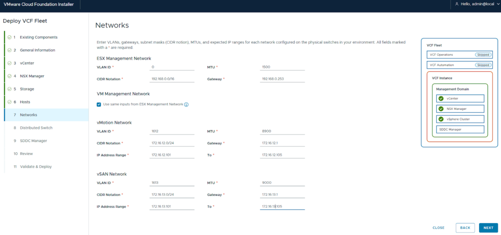 - Network Configuration: Configure the networks for ESX management, VM management, NSX, and vSAN.